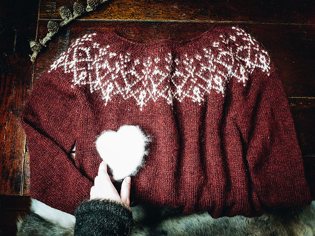 The Mjallhvít Sweater - Icelandic Style Sweater . The sweater is knit bottom-up. Start by knitting the body and both sleeves up to the yoke. The underarm stitches of the body and the sleeves are transferred to pieces of scrap yarn or stitch holders and the remaining stitches of the body and the sleeves are combined on a circular knitting needle to form the yoke which is shaped by simple decreases until the neckline stitches are cast off. The underarm stitches on the body and the sleeves are grafted together by the Kitchener stitch.
